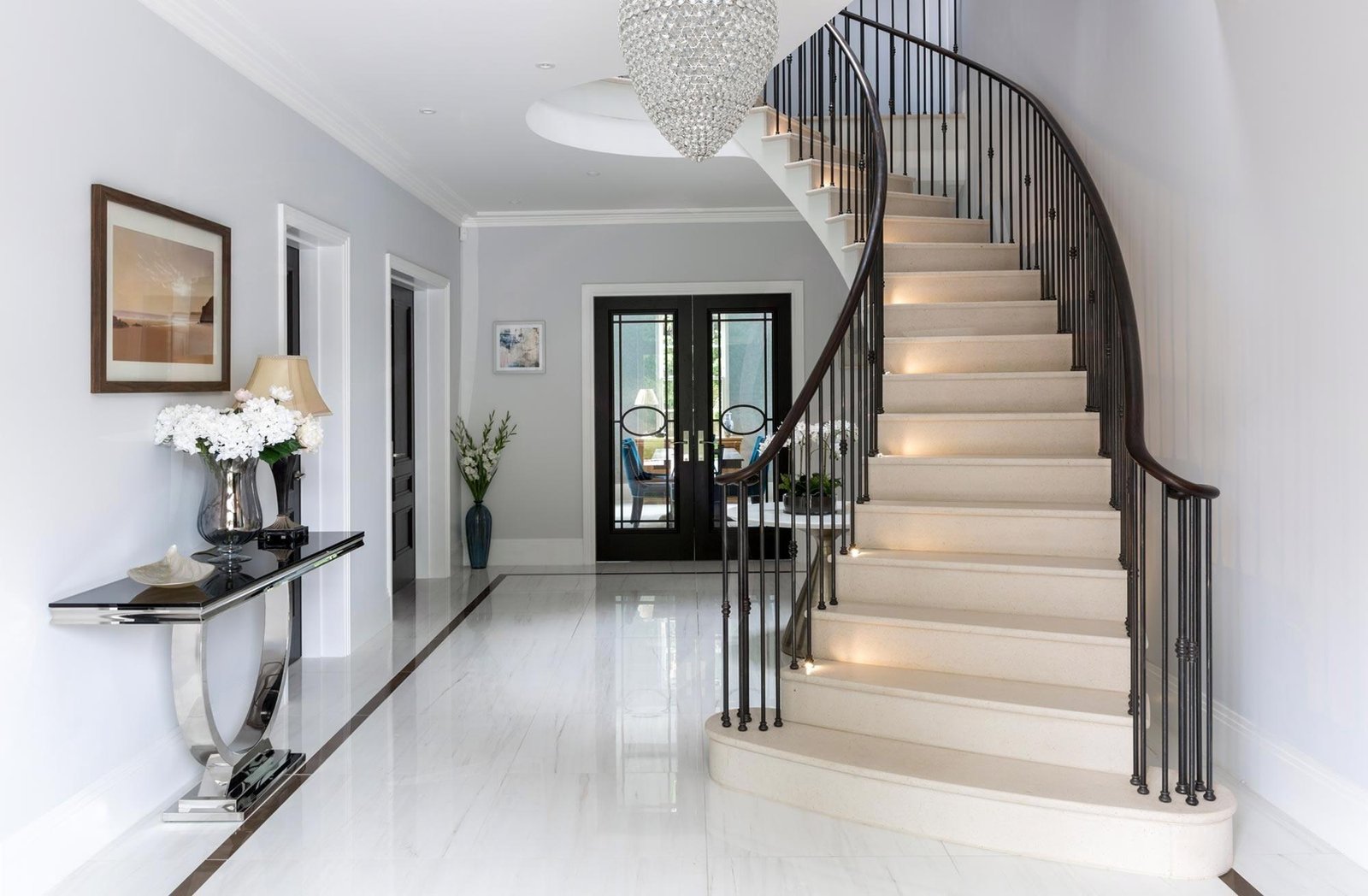 Non-slip limestone treads (R10 rating) reveal spiral fossils underfoot. Structural integrity lasts centuries, compatible with underlighting.
